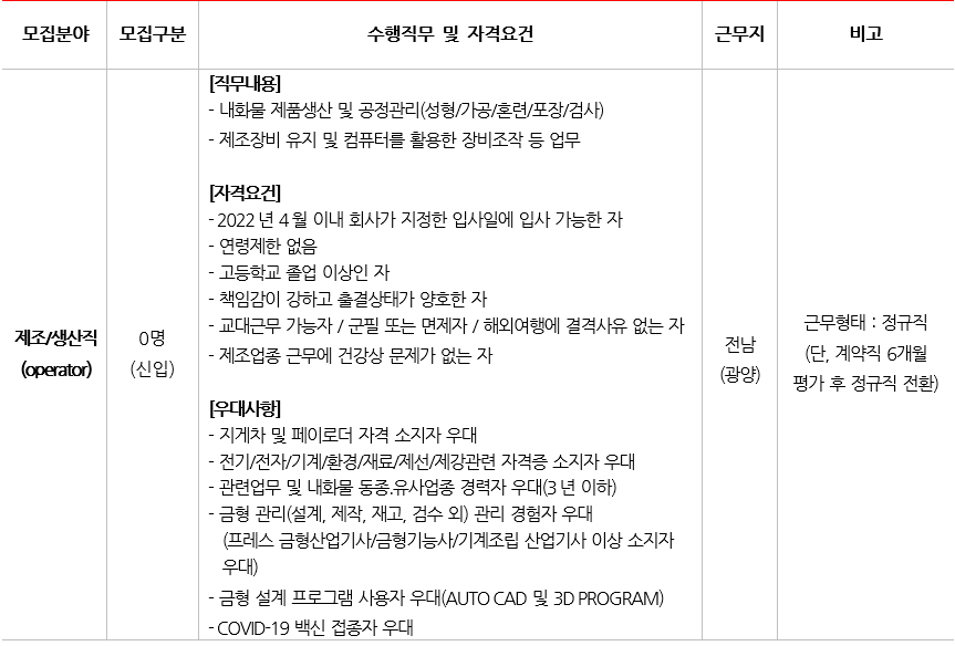 - 접수방법 : 조선내화(주)홈페이지 공고(http://www.chosunref.co.kr)또는
