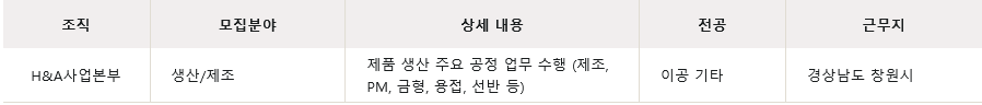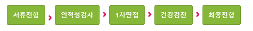 - 지원서 작성(3/10~16) > 1차 서류결과 발표(3/17) > 인성검사(온라인, 3/19~20) > 최종 서류 발표(3/23) > 건강검진(3/24~26) > 면접(3/26~27) > 최종 합격자 발표(3/31) > 입사(4/4 or 4/11)