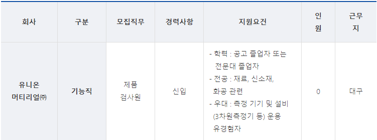 - 전형절차 : 서류전형 > 온라인 인적성검사 > 면접전형 > 채용검진